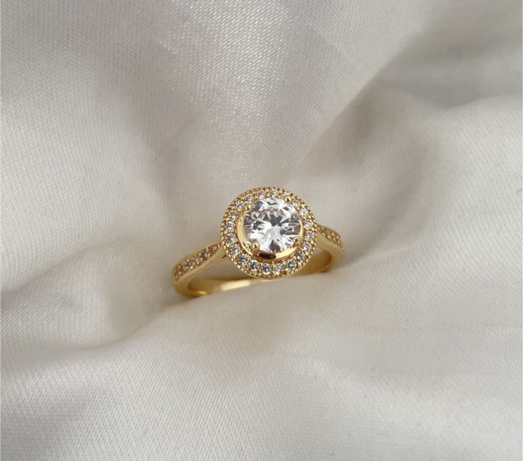 Anel com banho de ouro 18 k e ródio, com pedra oval leitoso facetada.