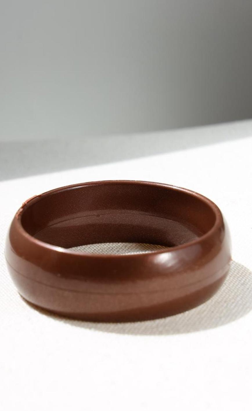 Bracelete rígido em acrílico marrom translúcido, base de latão interno, fecho de correr.
