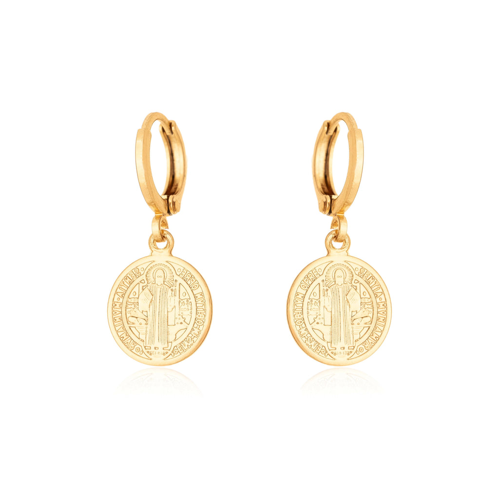 Brinco ponto de luz, banho de ouro 18 k e ródio branco, medalha estampada de São Bento.