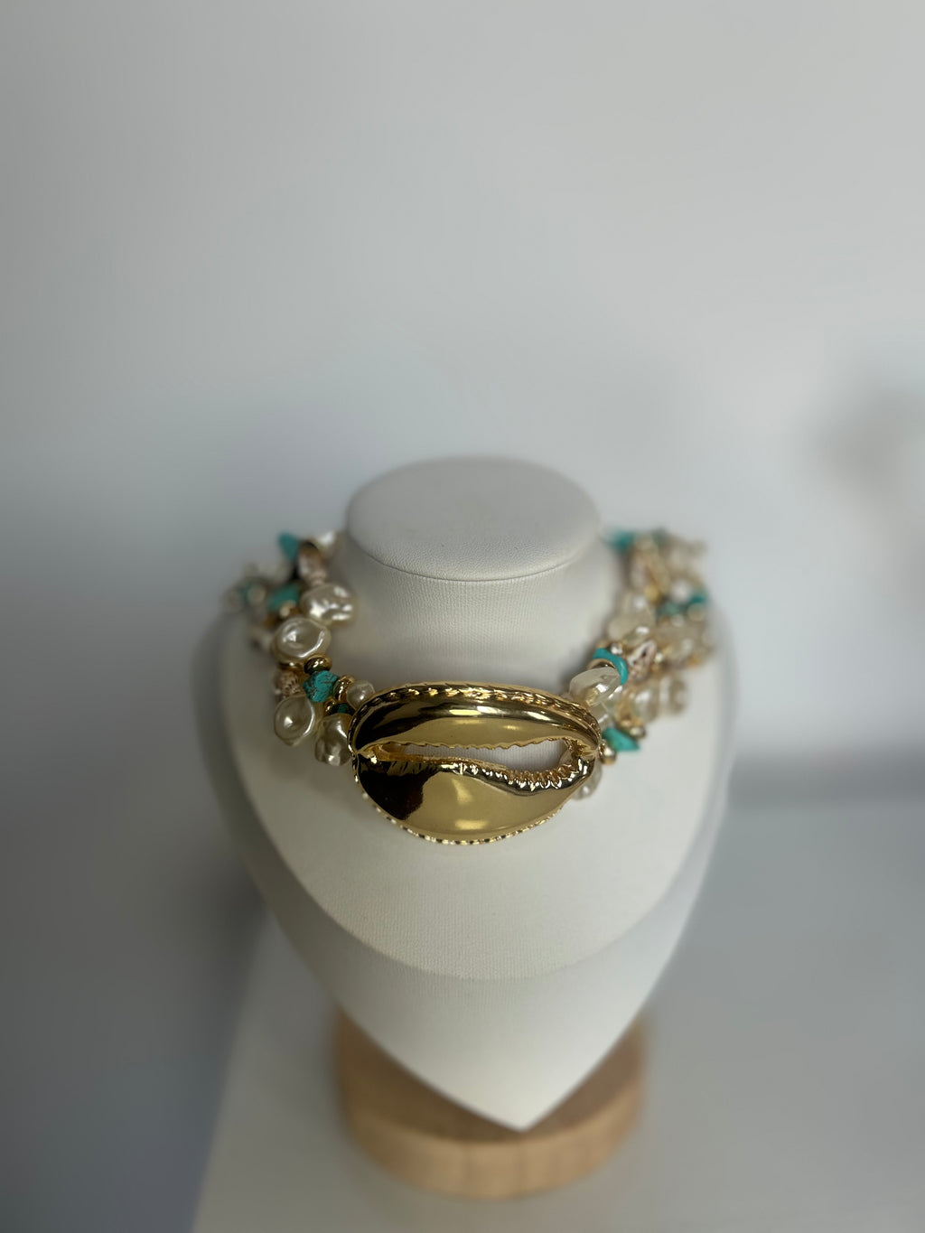 Pérolas e conchas em perfeita harmonia, criando um acessório cheio de personalidade, presença e charme praiano chic — o toque que transforma qualquer look.