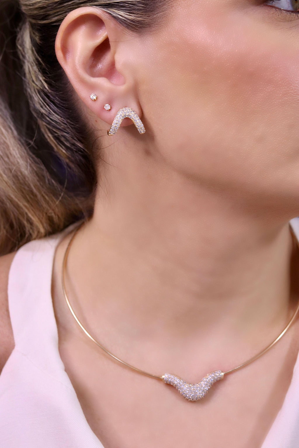 Conjunto colar e brinco com banho de ouro 18 k e ródio branco, design ondulado e cravação de zircônias.