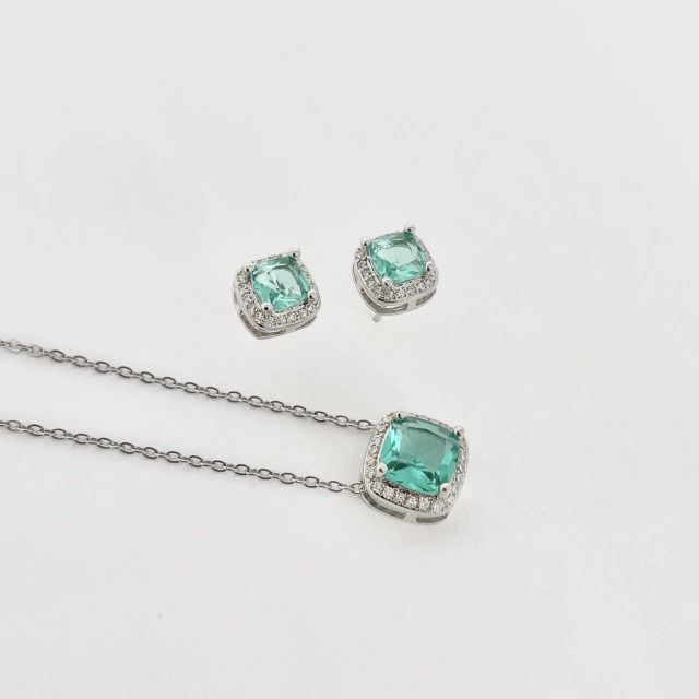 Conjunto colar e brinco, banho de ródio branco, pedra central turmalina envolta por halo de zircônias.
