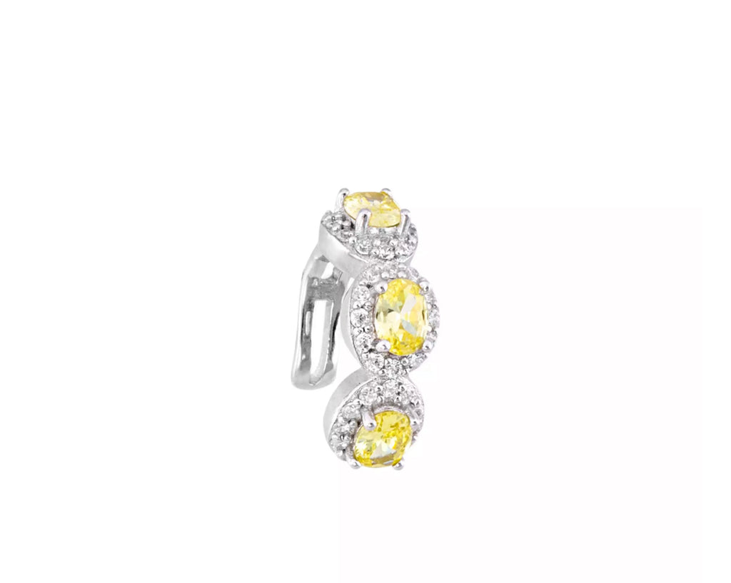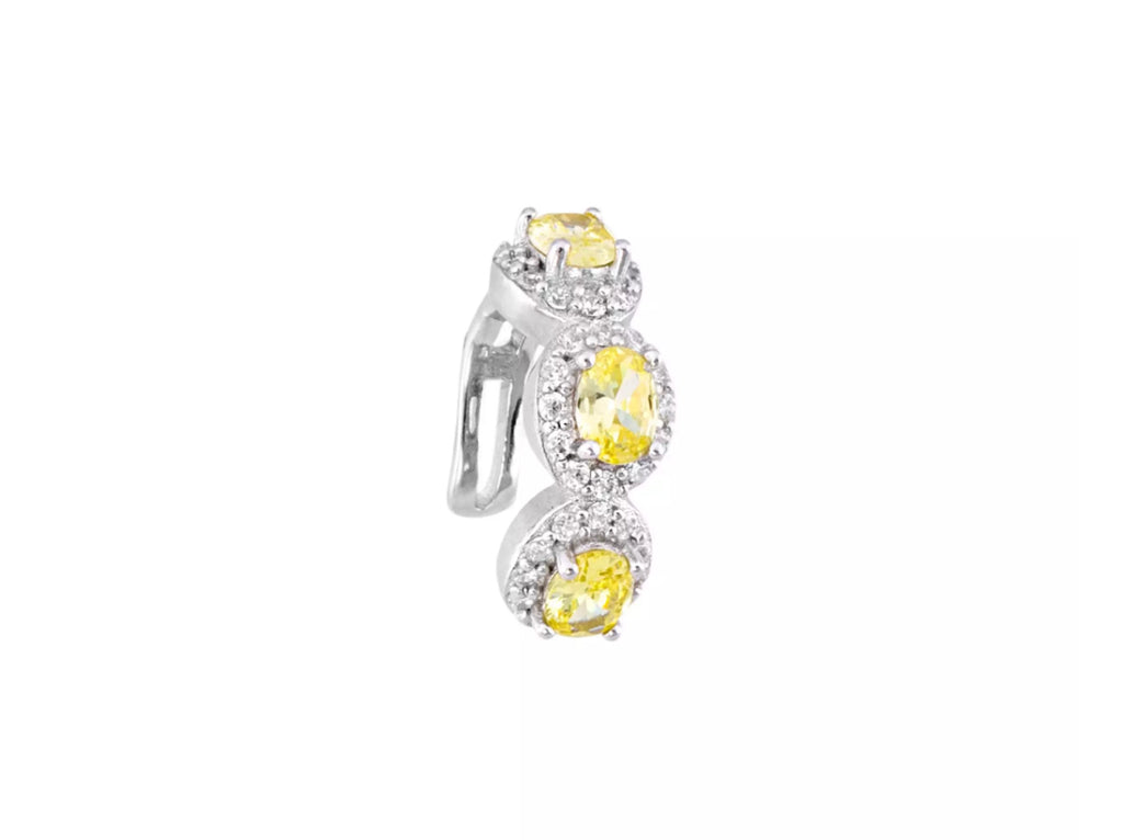 O Piercing Fake Cravejado yellow em Prata 925 com banho de ródio é a escolha perfeita para quem busca brilho, modernidade e um toque de cor sem precisar de perfuração. O design traz zircônias redondas na cor amarela, envoltas por mini zircônias brancas, garantindo um visual marcante e sofisticado.